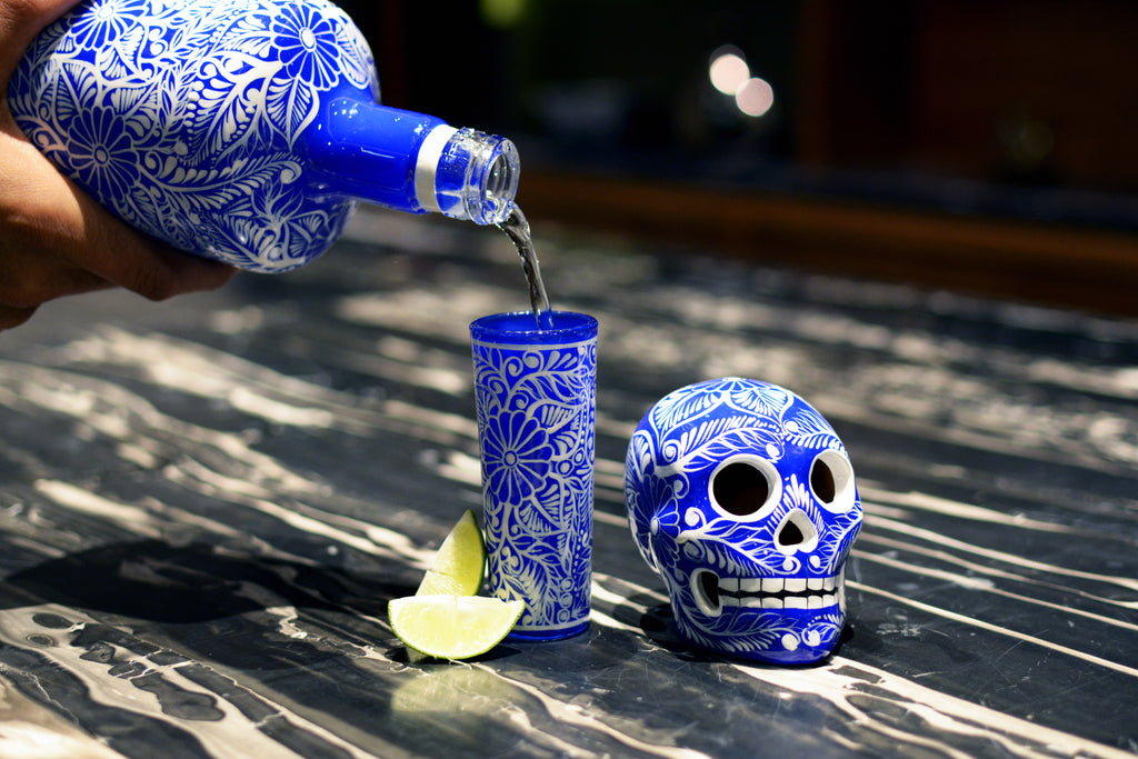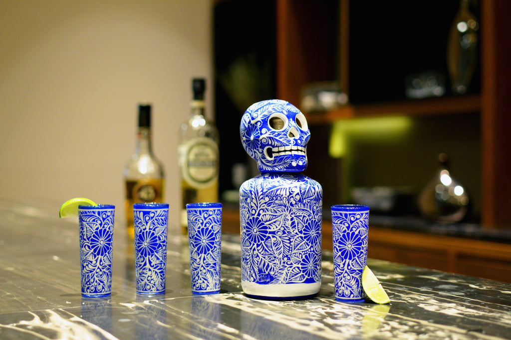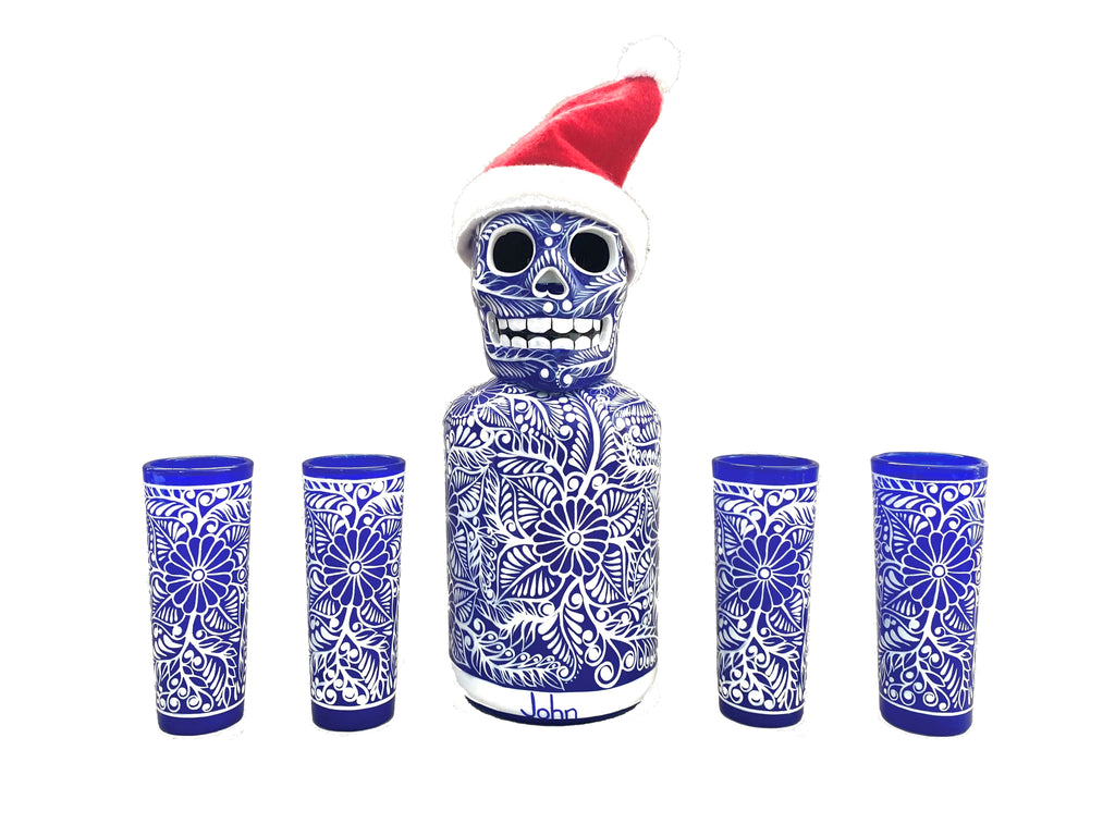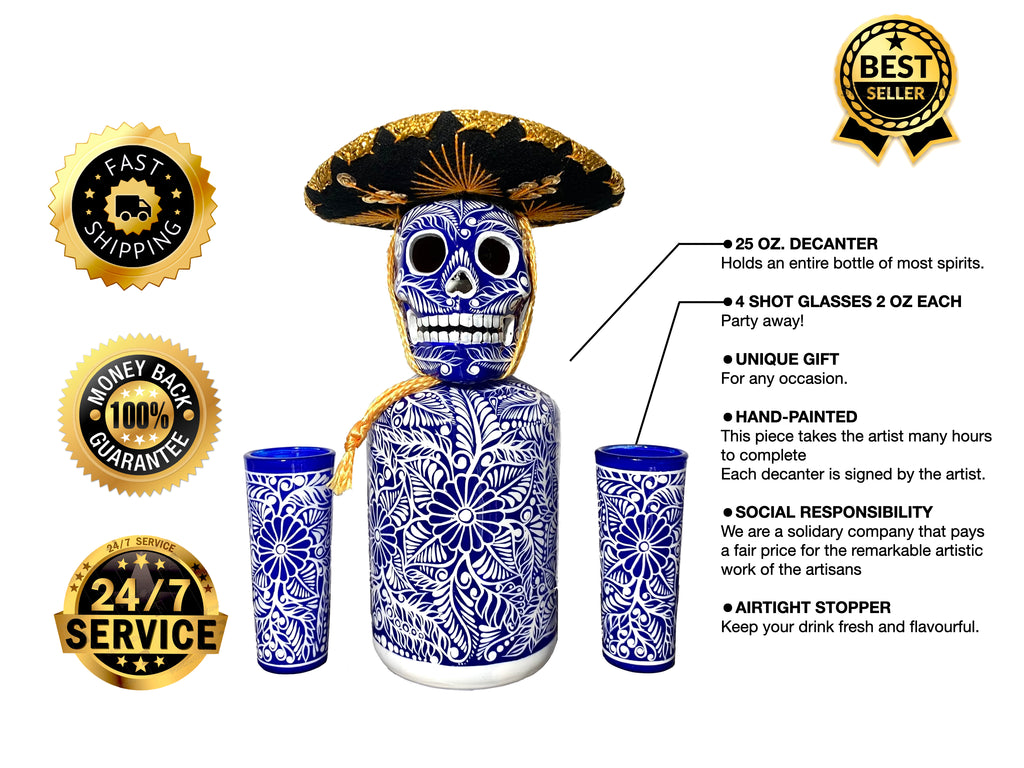 One of a kind hand-painted decanter set, skillfully crafted by artisans in Mexico. The delicate process for the elaborate design of this set takes the artisan many hours to complete. The head of the bottle is a skull made out of clay and it's signed by the artist. The bottle is not only a decoration but it also has the functionality to be filled with any desired liquid transforming this piece of art into a beautiful utility.